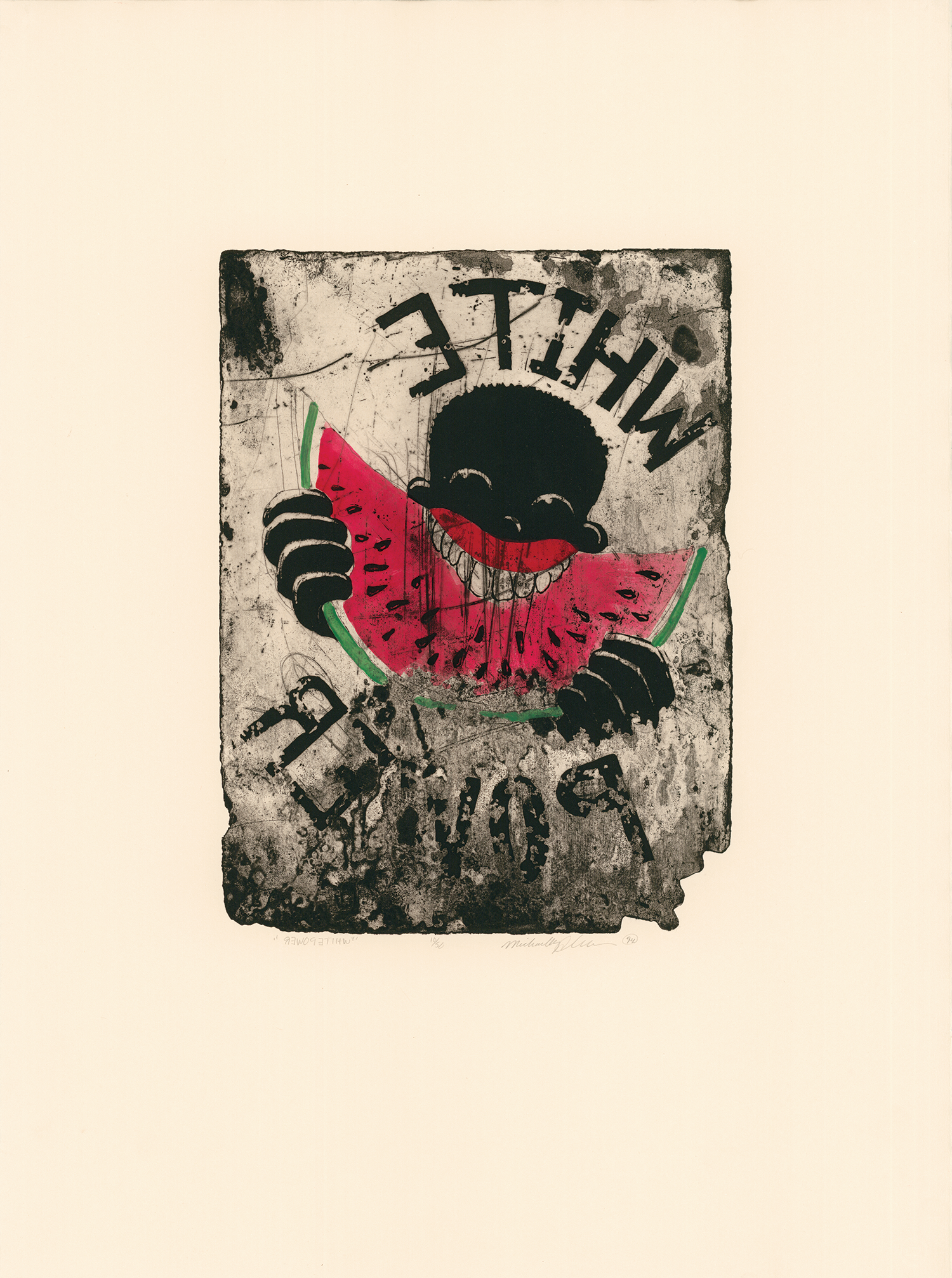 Copper plate with irregular edge. Line etch and deep aquatint. Open bite and manual abrasions to plate. Intentional reverse lettering. Copper Lincoln penny used for embossment from back of print into gray lower right area of the print.